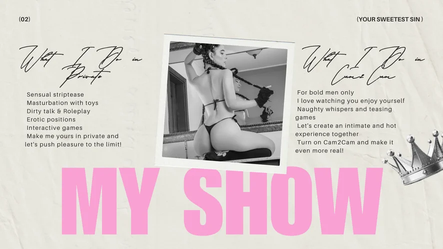 Flash Tits · Flash Ass · Flash Feet · Cameltoe · Hairy Pussy · Big Booty · Small Tits · POV · Dirty Talk · Ahegao · Squirting · Deepthroat · Foot Fetish · Submissive · Bondage · Oil Play · Lingerie · Roleplay · Spanking · JOI · CEI · Creampie · Finger Sucking · Cosplay · Gamer Girl · White Latina · Cam2Cam · Custom Video · Erotic Dance · Close-up Ass · Orgasm Show · Naughty Chat · Tip Menu
